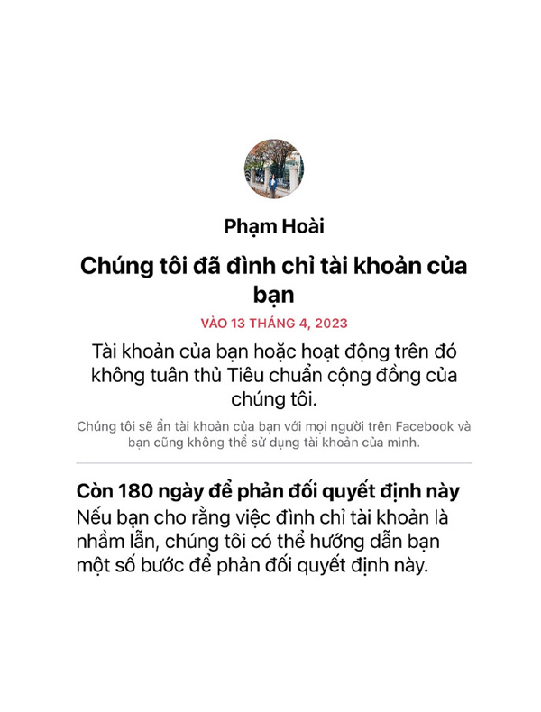 • Dấu hiệu: Facebook thông báo bạn vi vô hiệu hóa do vi phạm
